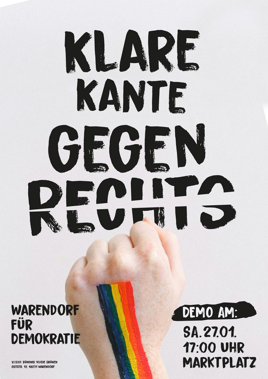 Am kommenden Samstag, den 27.01.2024 um 17:00 Uhr rufen alle Parteien und Vereine im Rat zu einer Kundgebung auf dem Marktplatz der Stadt Warendorf auf. Unter dem Motto „Klare Kante gegen Rechts – Warendorf für Demokratie“ wollen wir mit unserer vielfältigen Stadtgesellschaft ein Zeichen gegen Rassismus setzen. Gerade jetzt sind wir alle dazu aufgerufen gegen rechtsradikale Umtriebe und menschenverachtende Äußerungen aufzustehen! Wir freuen uns auf ein breites Zeichen der Solidarität der Warendorfer Zivilgesellschaft und laden alle Bürger*innen, Vereine und Initiativen zur Teilnahme ein.