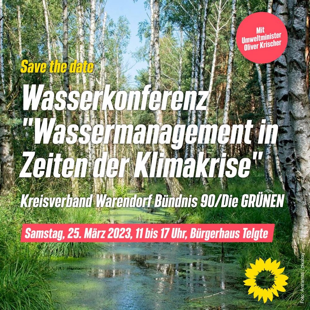 mit der Klimakrise wird sich auch unser Umgang mit der Ressource Wasser anpassen müssen. Im Kreisverband Warendorf beschäftigen wir uns seit vergangenem Sommer mit dem Thema und möchten euch nun herzlich zu unserer Wasserkonferenz im März und in unseren Kreis einladen. Wir freuen uns sehr über eure Teilnahme und senden euch heute ein SAVE-THE-DATE für unsere Veranstaltung:
