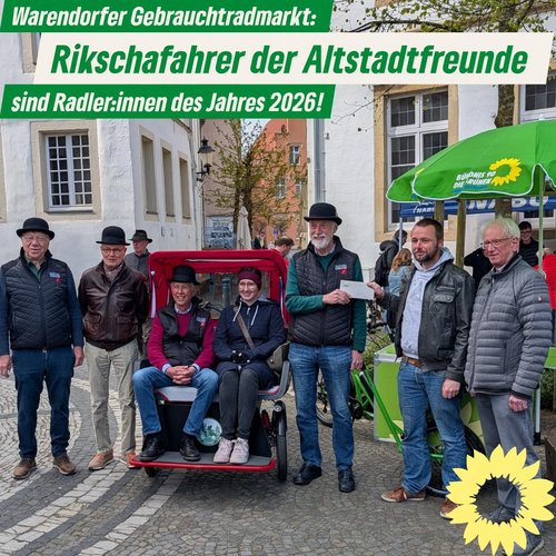 Heute, am 25. April, fand wieder der alljährliche Warendorfer Gebrauchtradmarkt statt – den der Ortsverband Bündnis 90/Die Grünen Warendorf gemeinsam mit u.a. dem Runden Tisch Radverkehr organisiert hat. Wie jedes Jahr hat der Ortsverband auch diesmal den oder die Radler:in des Jahres gekürt. Der Preis in Höhe von 100 € ging in diesem Jahr an die engagierten Rikschafahrer:innen der Altstadtfreunde Warendorf. Mit viel Herz setzen sie sich ehrenamtlich dafür ein, immobile Menschen kostenlos innerhalb von Warendorf zu befördern – zum Beispiel zu Arztterminen oder anderen wichtigen Zielen. Dieses großartige Engagement verdient die volle Unterstützung und zeigt einmal mehr, wie stark der Zusammenhalt in Warendorf ist. Der Ortsverband zieht den Hut vor den Rikschafahrer:innen und hofft, dass dieses wunderbare Projekt noch lange weitergeführt wird!
