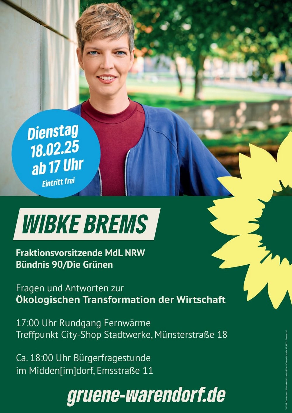 Anschließend geht es ab 18:00 Uhr in die Gaststätte "Midden[im]dorf", Emsstraße 12, wo Wibke Brems erläutern wird, wie eine nachhaltige Energiepolitik zu mehr Wirtschaftswachstum führen kann und welche konkreten Maßnahmen man hierfür auf Landesebene ergreifen kann.